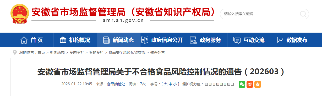 安徽省市場監督管理局關于不合格食品風險控制情況的通告(202603)