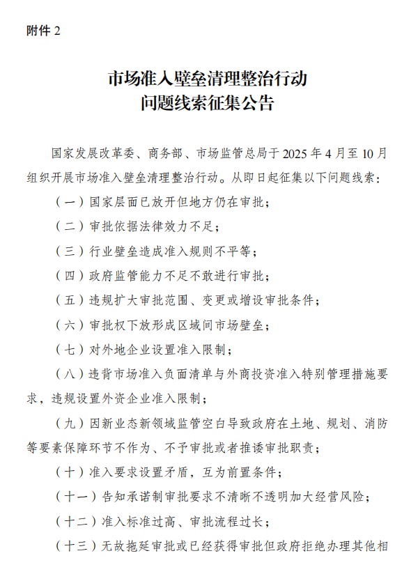 2.市場準入壁壘清理整治行動問題線索征集公告