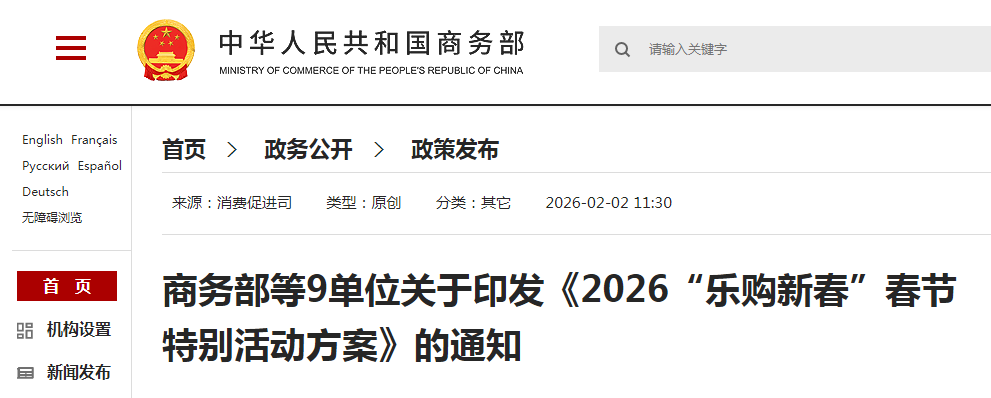 商務部等9單位關于印發《2026“樂購新春”春節特別活動方案》的通知