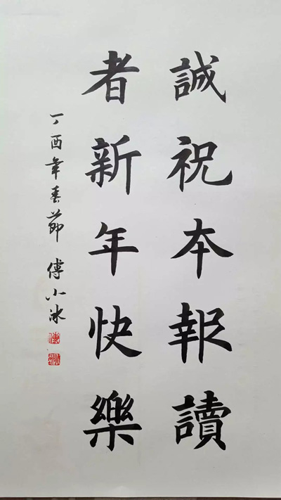 傅小冰先生從小酷愛書法藝術,在多年的探索追求中廣納博取各書法藝術流派之精華,逐步形成了自己獨特的藝術風格;以扎實的造型基本功和斑斕的色彩感染力體現了中華傳統文化的厚重美。近年來,傅小冰先生作品獨具匠心,內涵吉祥瑞意,深受海內外專家、學者和社會各界好評。