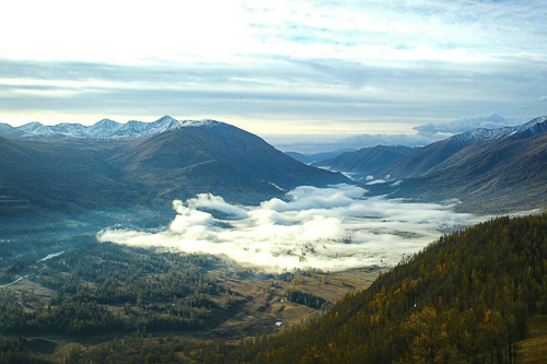 峽谷中的鄰近湖口的禾木村,是圖瓦人居住的村落。遠處雪山環繞,四周森林茂密,村莊時常淹沒在流動的云海中,美如仙境。