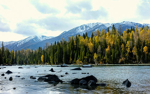 喀納斯湖口,秀美而壯闊。在雪山層林的倒映中,碧綠色的湖水,沖刷著墨玉般的巨石,奔涌而下,流入喀納斯河。