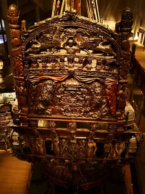 細看艦首,一只跳躍的雄獅勇猛向前,獅子象征國王和瑞典軍隊;20個羅馬皇帝分列兩邊,他們是瑞典君主引以自豪的先驅。