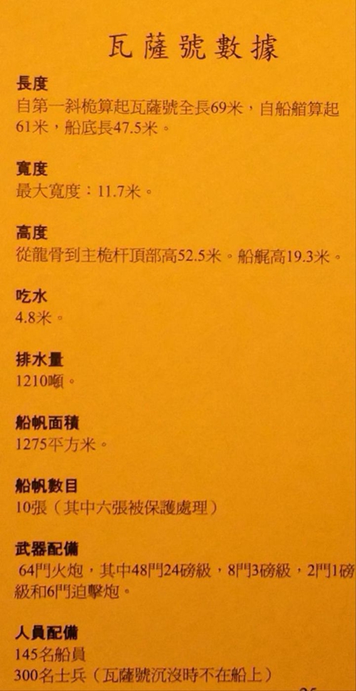 瓦薩號船體重約1000噸,體積900立方米。另有13500件碎片、500件雕刻、200件裝飾品和12000件由木、麻、皮革和金屬制成的小型物件。