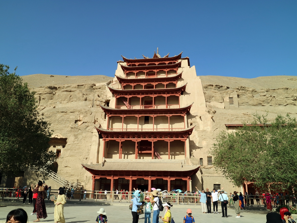 莫高窟,是我們前半段行程的重點。但不得不說,也是我認為最遺憾的景點:因為疫情,目前這里只能買到B類門票,參觀4個洞窟。這天一早,景區入口已經排起長隊,接著每進一個洞窟,由于參觀的人太多,不過兩三分鐘就會被工作人員的廣播喇叭和后面擁進來參觀人群“趕”出去,根本沒時間仔細觀賞壁畫作品。難怪很多人說,不來這里后悔,來過這里更后悔!
