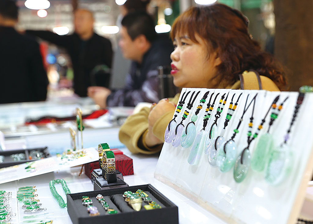 圖為游客在瑞麗市姐告玉城挑選玉石珠寶。