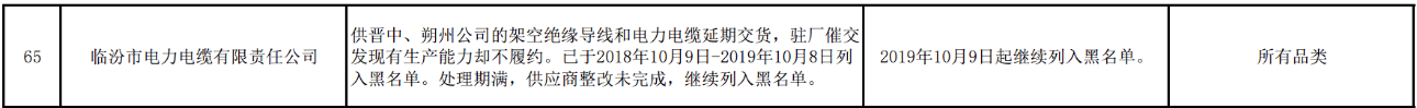 自2019年10月9日起,臨汾市電力電纜有限責任公司繼續被列入黑名單。