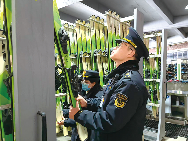 近日,浙江省安吉縣云上草原景區(qū)滑雪場開滑。為切實(shí)營造放心舒心的冰雪消費(fèi)環(huán)境,安吉縣市場監(jiān)管局聚焦景區(qū)滑雪板、雪鞋、頭盔等租賃雪具開展專項(xiàng)監(jiān)督檢查,確保來源合法、質(zhì)量可靠。圖為該局執(zhí)法人員在檢查雪具。 帥昊宇 攝