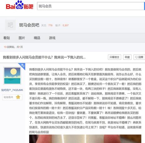 在百度貼吧里,有自稱斑馬會員的講述自己如何被洗腦加入,又在購買斑馬商品出現質量問題后得不到解決的經歷。