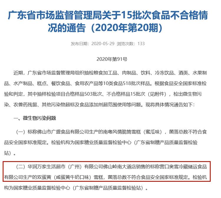 據廣東省市場監管局通報顯示,華潤萬家生活超市(廣州)有限公司佛山嶺南大道店銷售的、標稱營口奧雪冷藏儲運食品有限公司生產的“奧雪”雙蛋黃(咸蛋黃牛奶口味)雪糕(72克/袋,2019/6/3),5次菌落總數檢出值中有4次超過國標限定最小值(25000CFU/g)。