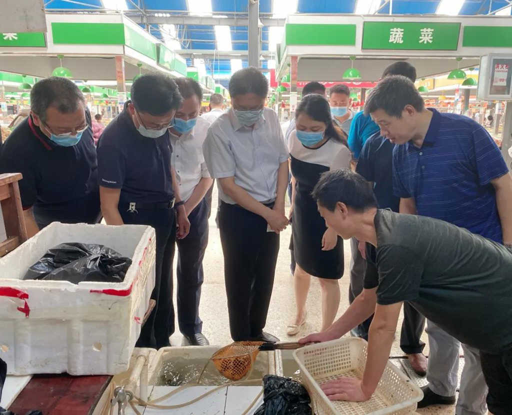 副市長劉恒友(中)突擊檢查農(nóng)貿(mào)市場內(nèi)水產(chǎn)品經(jīng)營戶,嚴(yán)禁銷售漢江野生魚
