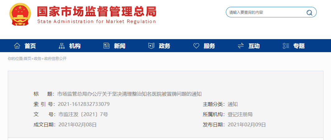 市場監(jiān)管總局辦公廳關于堅決清理整治知名醫(yī)院被冒牌問題的通知