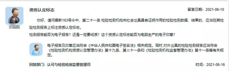 近期,有網友在市場監管總局網站公眾留言系統咨詢“檢驗檢測機構資質認定”等相關問題,市場監管總局認可與檢驗檢測監督管理司給予了答復。