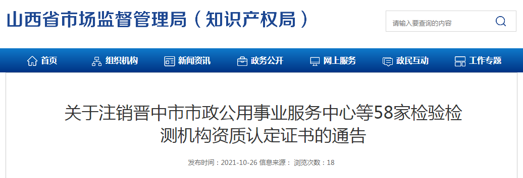 中國質量新聞網訊 10月26日,山西省市場監督管理局網站發布關于注銷晉中市市政公用事業服務中心等58家檢驗檢測機構資質認定證書的通告。