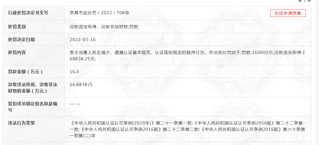 依據《中華人民共和國認證認可條例2016版》第六十條第一款第(二)項,北京市昌平區市場監督管理局對國信正通(北京)檢驗認證有限公司罰款160000元;沒收違法所得168838.25元;責令當事人改正減少、遺漏認證基本規范、認證規則規定的程序行為。