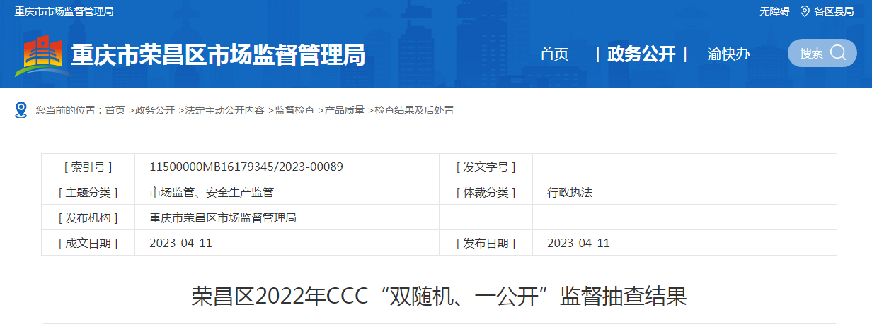 中國質量新聞網訊 2023年4月11日,重慶市榮昌區市場監督管理局網站公布2022年CCC“雙隨機、一公開”監督抽查結果。