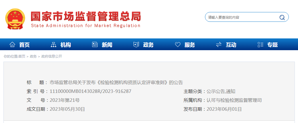 市場監(jiān)管總局關于發(fā)布《檢驗檢測機構資質(zhì)認定評審準則》的公告