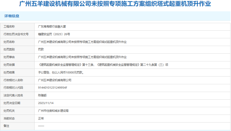 處罰信息顯示,在廣東南粵銀行金融大廈工程中,廣州五羊建設機械有限公司未按照專項施工方案組織塔式起重機頂升作業。依據《建筑起重機械安全監督管理規定》第十三條、《建筑起重機械安全監督管理規定》第二十九條第(三)項,廣州市住房和城鄉建設局對該公司予以警告,處以人民幣1萬元罰款的行政處罰。