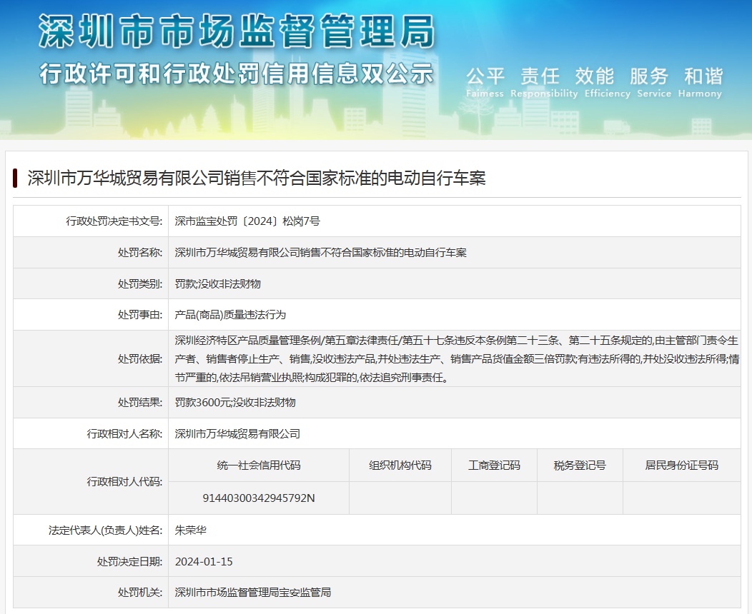 深圳市萬華城貿易有限公司銷售不符合國家標準的電動自行車案