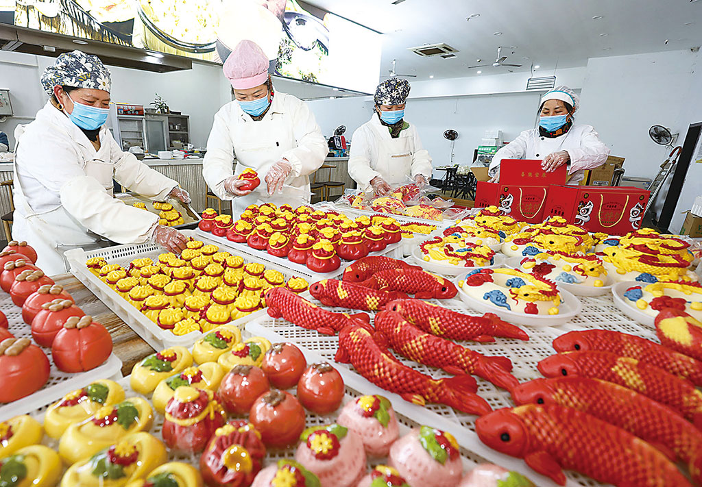 新春佳節(jié)將至,安徽省淮北市面點(diǎn)師傅們利用果蔬汁和面粉為原材料,制作“生肖龍”“福”“元寶”“錢袋”和“鯉魚(yú)”等寓意美好的各式花饃,深受消費(fèi)者歡迎,暢銷當(dāng)?shù)厥袌?chǎng)。圖為淮北市人民路一面食加工點(diǎn),工人正在制作包裝各式花饃。 李 鑫 攝