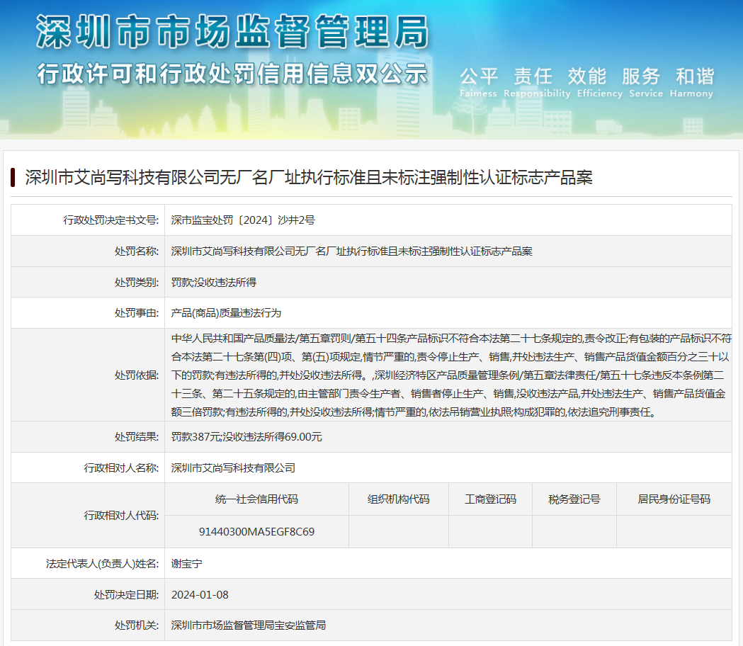 深圳市艾尚寫科技有限公司無廠名廠址執行標準且未標注強制性認證標志產品案
