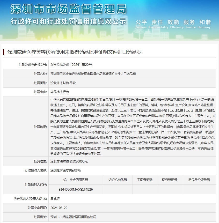 深圳蔻伊醫療美容診所使用未取得藥品批準證明文件進口藥品案
