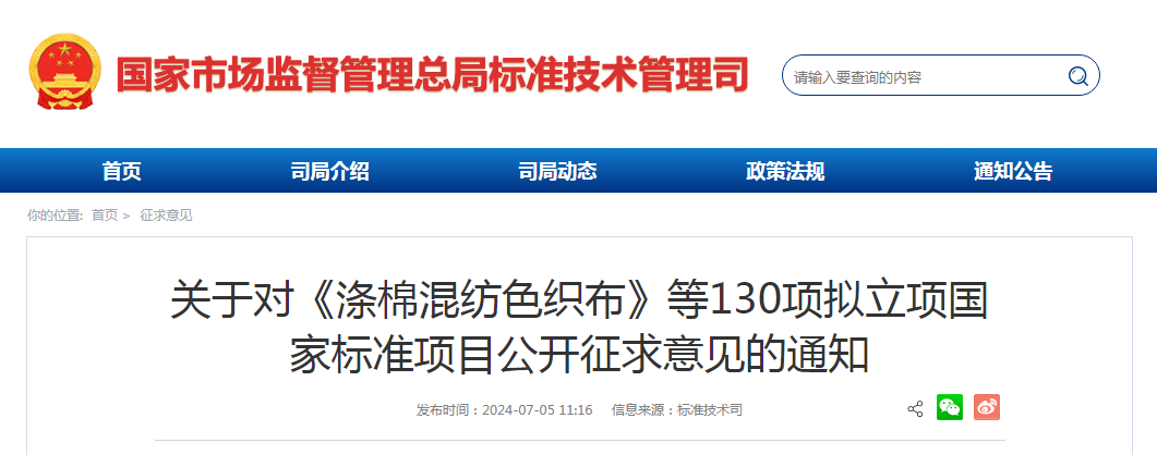 經研究,現對《滌棉混紡色織布》等130項擬立項國家標準項目公開征求意見,征求意見截止時間為2024年8月4日。請登錄請登錄標準技術司網站征求意見公示網頁http://std.samr.gov.cn/gb/gbSuggestionPlan?bId=10001901,查詢項目信息和反饋意見建議。