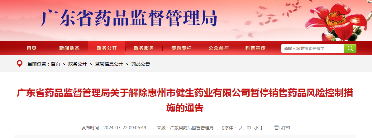 廣東省藥品監(jiān)督管理局關(guān)于解除惠州市健生藥業(yè)有限公司暫停銷售藥品風險控制措施的通告