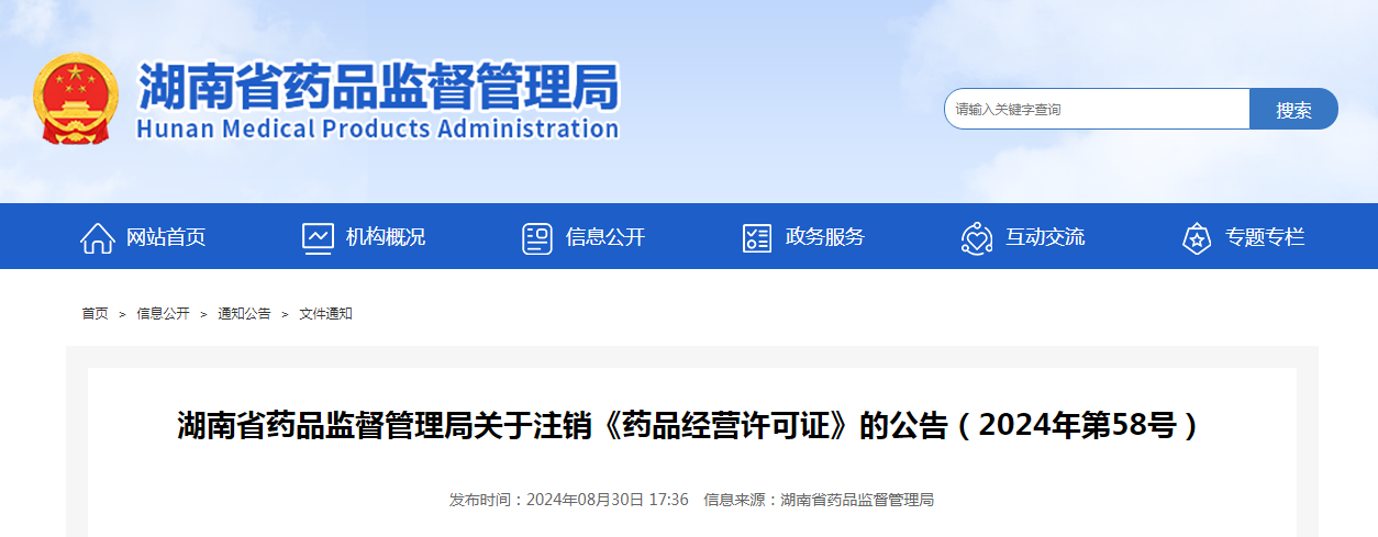 湖南省藥品監督管理局關于注銷《藥品經營許可證》的公告(2024年第58號)
