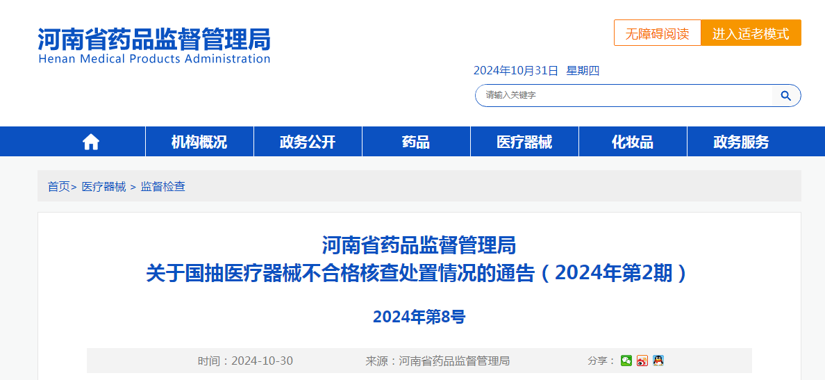 河南省藥品監督管理局關于國抽醫療器械不合格核查處置情況的通告(2024年第2期)