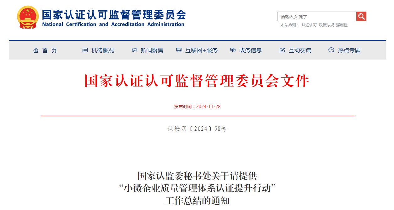國家認監委秘書處關于請提供“小微企業質量管理體系認證提升行動”工作總結的通知
