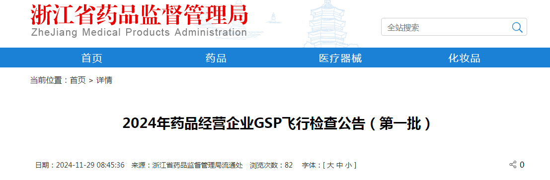 根據《藥品檢查管理辦法(試行)》《浙江省藥品生產流通飛行檢查實施辦法(試行)》《關于組織開展2024 年藥品 GSP 飛行檢查工作的通知》相關規定,現將2024年度第一批浙江省藥品經營企業GSP飛行檢查情況公開如下:
