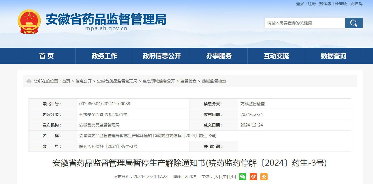 安徽省藥品監(jiān)督管理局暫停生產(chǎn)解除通知書(皖藥監(jiān)藥停解〔2024〕藥生-3號(hào))