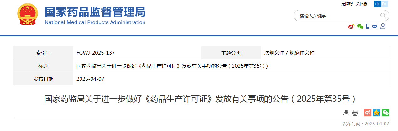 二、2025年7月1日以后發(fā)放的《藥品生產(chǎn)許可證》,各省級(jí)局應(yīng)統(tǒng)一以本行政區(qū)域內(nèi)電子證照二維碼形式管理,《藥品生產(chǎn)許可證》正本、副本的紙質(zhì)版和電子證照應(yīng)分別標(biāo)注二維碼。藥品生產(chǎn)許可、變更、委/受托等信息應(yīng)于相關(guān)工作完成后的5個(gè)工作日內(nèi)上傳至國(guó)家藥監(jiān)局《藥品生產(chǎn)許可證》管理模塊。