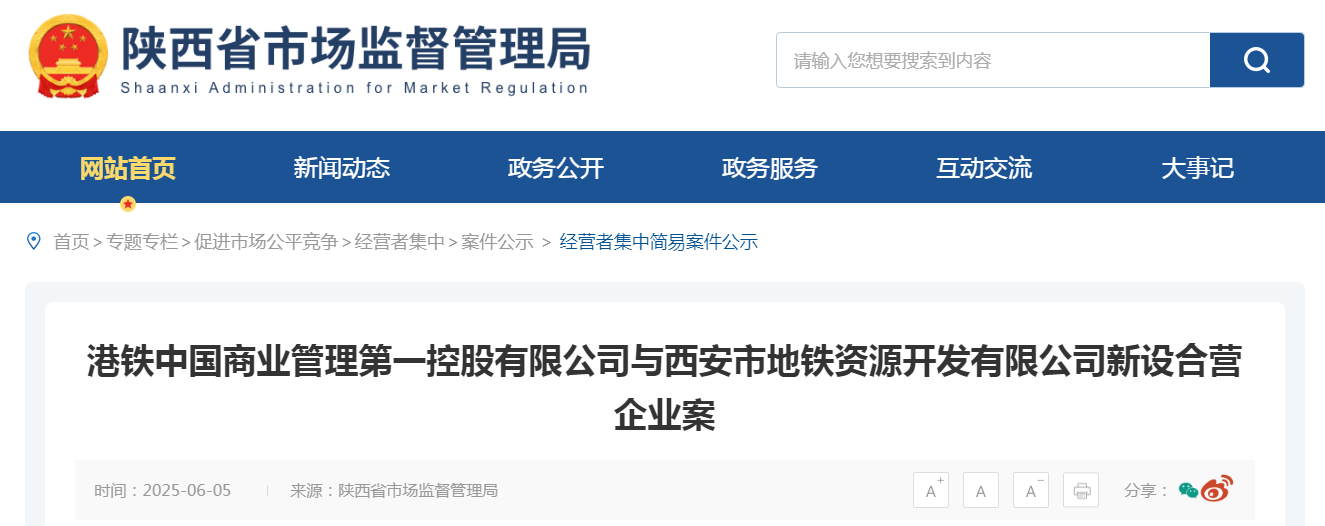 港鐵中國商業管理第一控股有限公司與西安市地鐵資源開發有限公司新設合營企業案