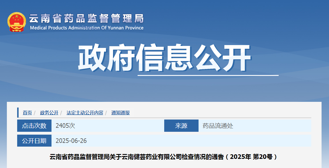云南省藥品監督管理局關于云南健蕓藥業有限公司檢查情況的通告(2025年 第20號)