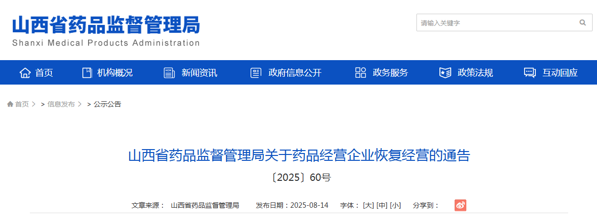 山西省藥品監督管理局關于藥品經營企業恢復經營的通告