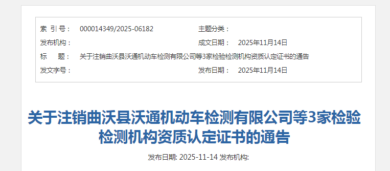 關于注銷曲沃縣沃通機動車檢測有限公司等3家檢驗檢測機構資質認定證書的通告