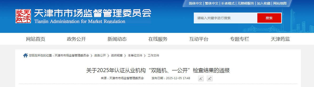 為深入實施市場監管“五大工程”,全面提高質量認證行業公信力,持續優化質量認證市場環境,按照《市場監管總局辦公廳關于開展2025年認證從業機構“雙隨機、一公開”檢查的通知》(市監認證函〔2025〕158號)要求,市市場監管委組織開展了2025年天津市認證從業機構“雙隨機、一公開”檢查工作。現將檢查有關情況通報如下: