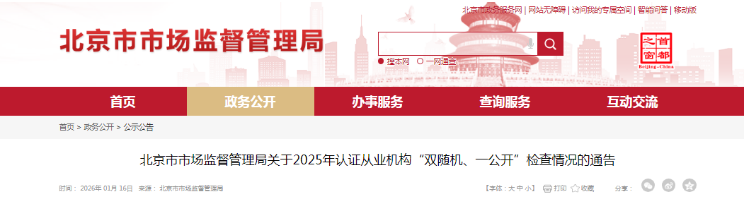北京市市場監督管理局關于2025年認證從業機構“雙隨機、一公開”檢查情況的通告
